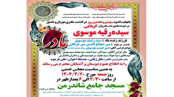 کل من علیها فان و یبقی وجه ربک ذو الجلال و الاکرام همکار ارجمند جناب آقای سید محمد میر عرفانی ⚫️ضایعه درگذشت بانو کربلایی #سیدهرقیهموسوی مادر مهربان و مومنتان را از صمیم قلب تسلیت عرض نموده، خداوند متعال روح پاکش را با سرورش فاطمه زهراء س محشور نماید و به بازماندگان صبر جزیل عنایت فرماید ◾️شهردار و اعضای شورای اسلامی شهر شاندرمن